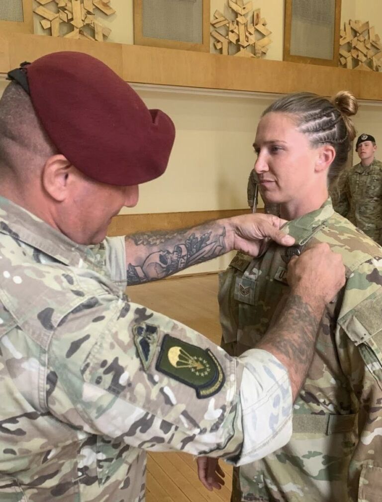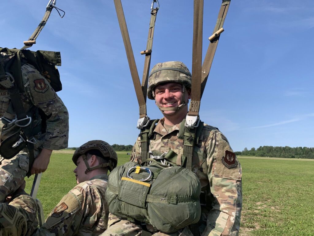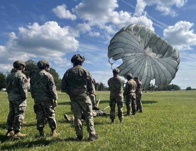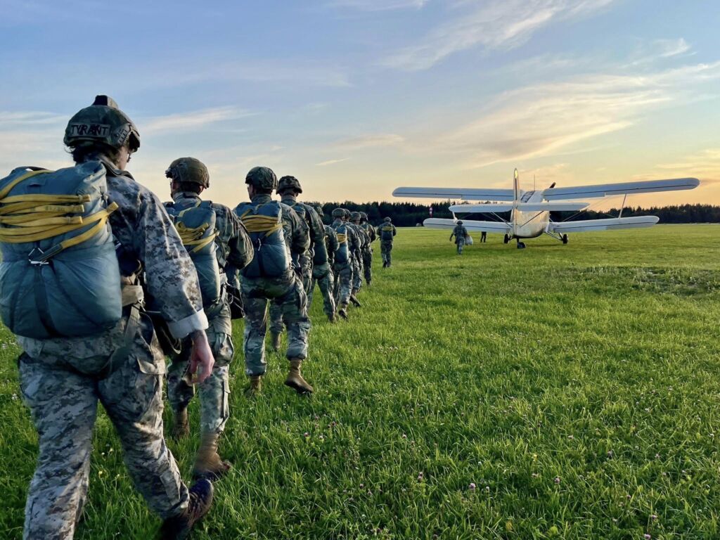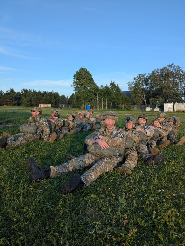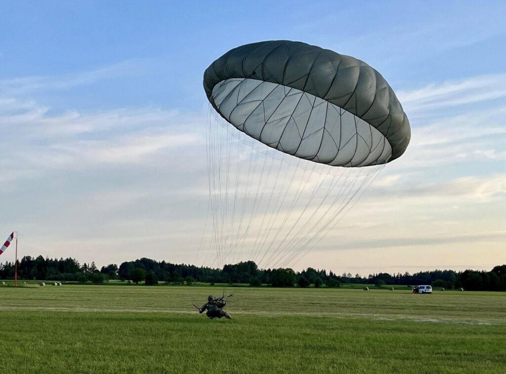 USAF personnel attending the Basic Airborne Course (BAC), jump with airborne veterans from USA South Africa Ukraine and Sweden during jump phase at EURPAR Airborne School in Rapla, Estonia. The BAC at European Paratroopers Airborne School includes Ground Phase - military parachute jump procedures, parachute landing falls (PLF), suspended harness, and mock door training - and Jump Phase - static line parachute descents, with current operational military round canopy parachute systems - where students test their airborne skills to become military parachutist qualified and earn the coveted airborne wings.