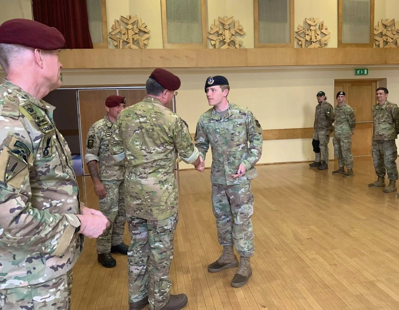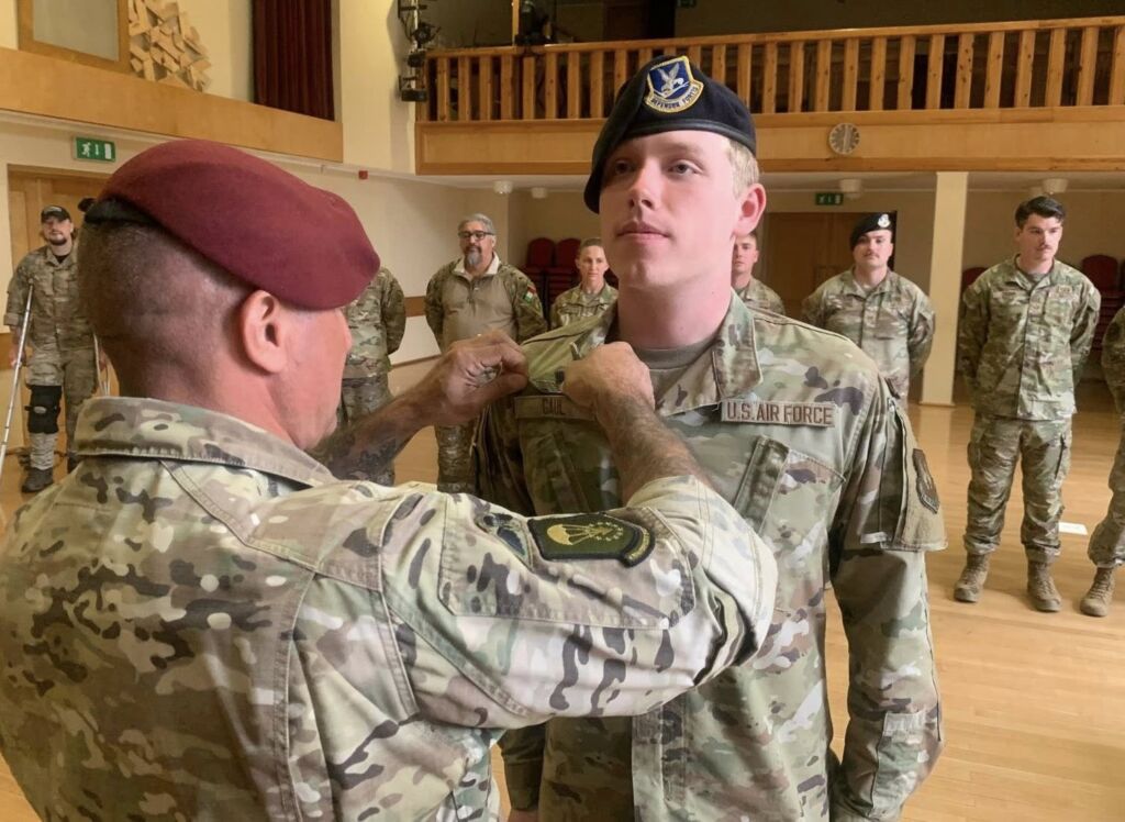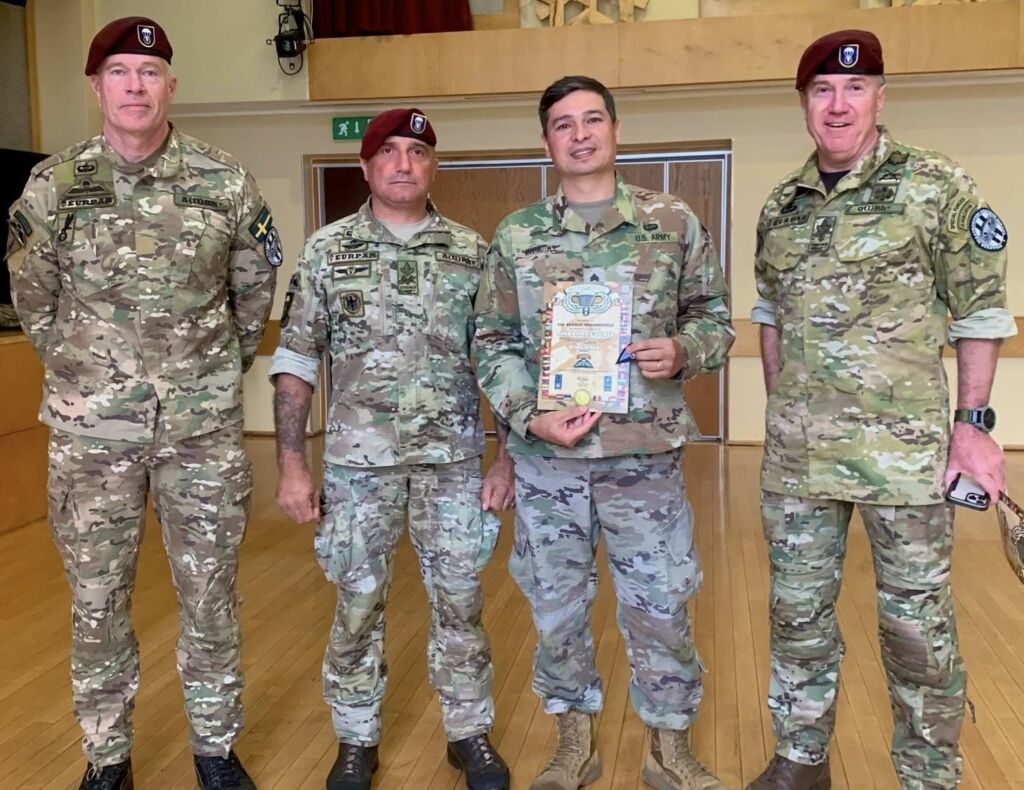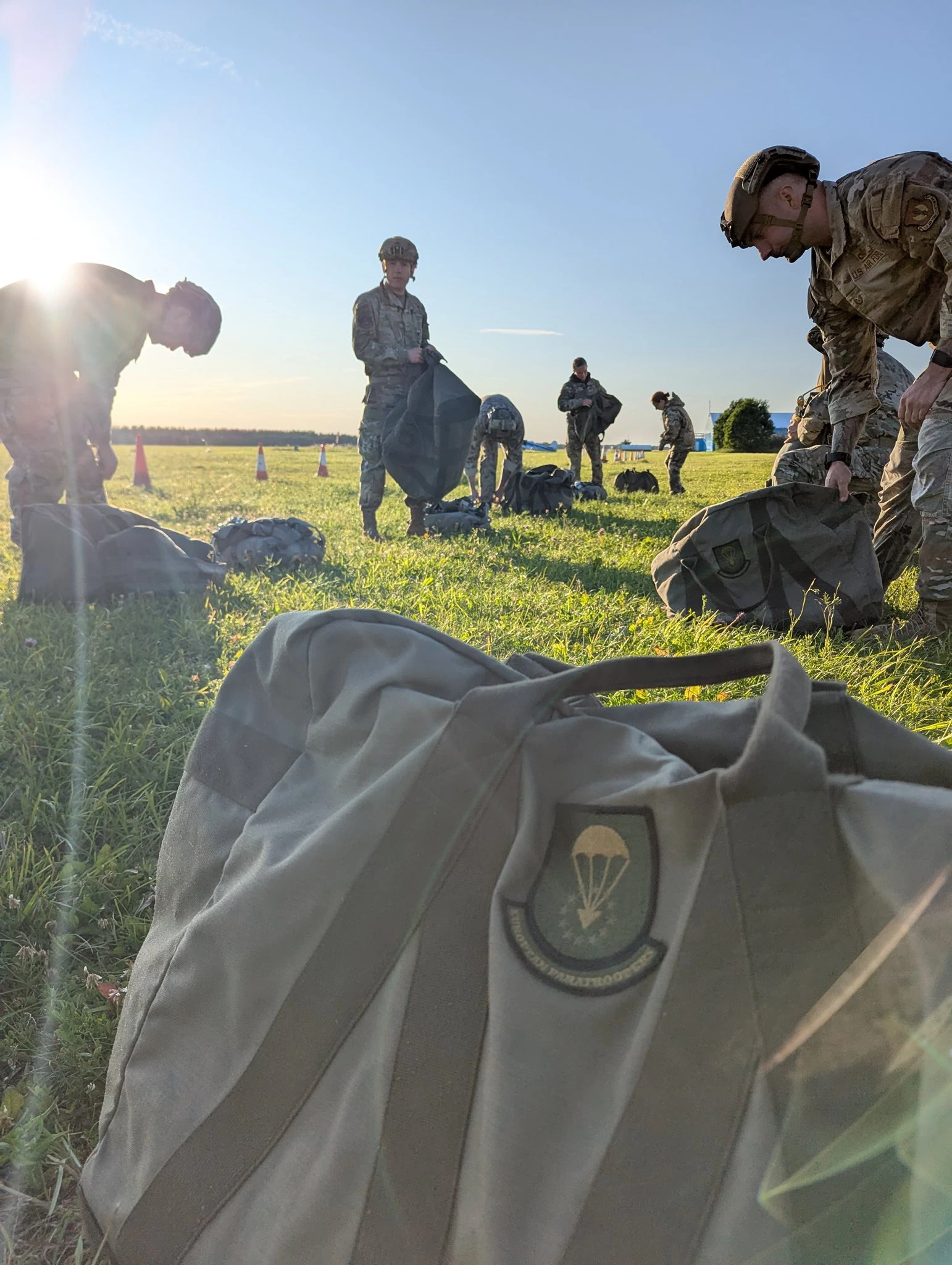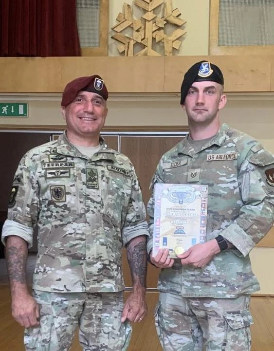 USAF personnel attending the Basic Airborne Course (BAC), jump with airborne veterans from USA South Africa Ukraine and Sweden during jump phase at EURPAR Airborne School in Rapla, Estonia. The BAC at European Paratroopers Airborne School includes Ground Phase - military parachute jump procedures, parachute landing falls (PLF), suspended harness, and mock door training - and Jump Phase - static line parachute descents, with current operational military round canopy parachute systems - where students test their airborne skills to become military parachutist qualified and earn the coveted airborne wings.