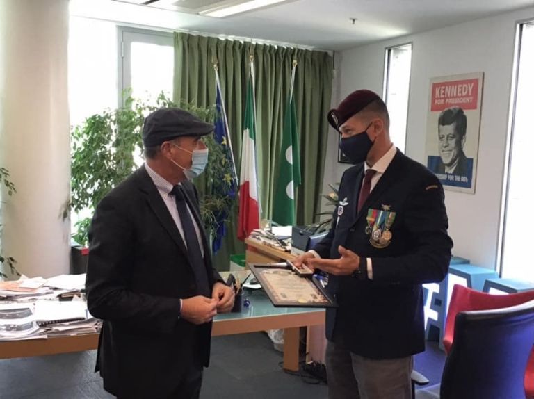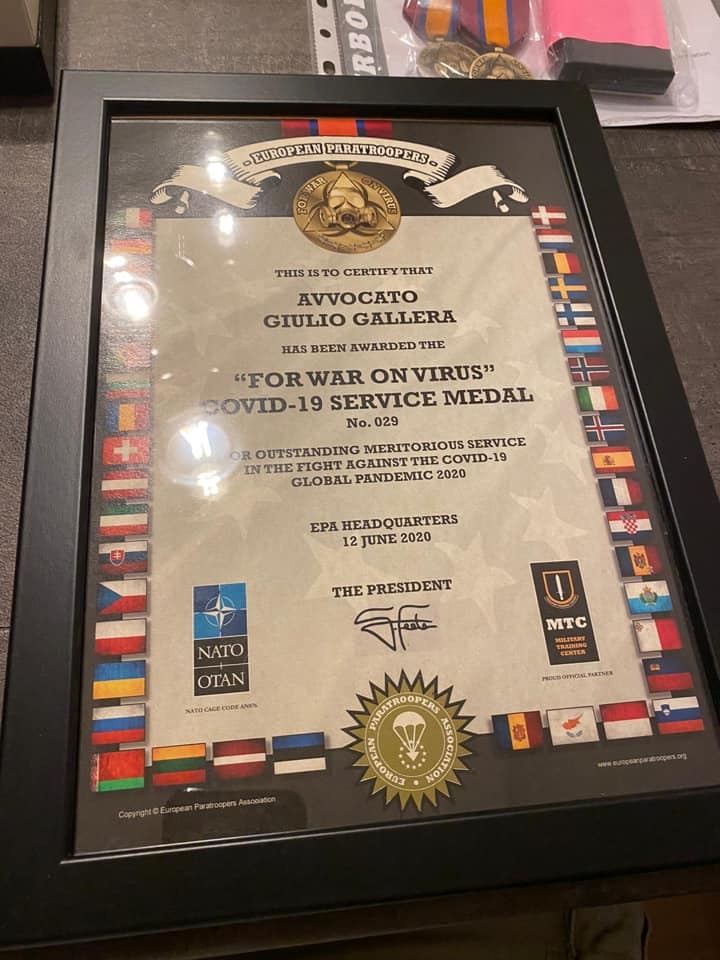 The European Paratroopers ?For War On Virus? COVID-19 Service Medal was presented to the Lombardy Health and Welfare Minister Giulio Gallera for his months-long, sustained effort to fight the virus and assist the population in Lombardy during the critical phases of the covid-19 crisis in Italy.