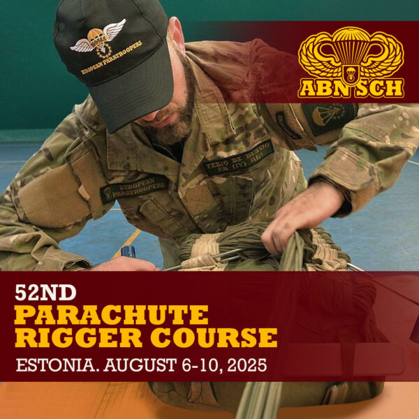 The PARACHUTE RIGGER COURSE is a military parachute rigger training course designed to give our members the opportunity to learn basic parachute rigger techniques and advance their military parachute skills and experience. During our course you will receive an intensive full-immersion theoretical and practical parachute rigger training, in accordance to military standards, by highly qualified rigger instructors coming from NATO's airborne forces. Rigger students will be required to demonstrate their personnel parachute proficiency by physically performing a parachute jump with any parachute they have packed. You will improve your airborne experience and your military parachute skills. The aim of this course is to familiarize students with the basic military parachute rigger techniques, and round parachute systems packing procedures. These parachute rigger techniques and packing procedures are being used worldwide by paratroopers and airborne forces. Static line round parachute packing procedures, parachute systems minor repairs and maintenance, and safety procedures will be emphasized. During this course the students will acquire rigger capabilities, skills and knowledge required to pack military round canopy parachutes. At the end of the course - once you have successfully completed the practical examination, you will be ready to move onto the final step - inspecting and repacking 10 main parachutes and perform the required parachute jump descent with any parachute you have packed to be finally awarded with the European Rigger Wings (Static Line Military Round Canopy Rigger Qualification Badge and International Certificate of Parachuting Proficiency).You will learn the work of a military rigger and you will be ready to support the European Paratroopers ABN SCH airborne operations.
